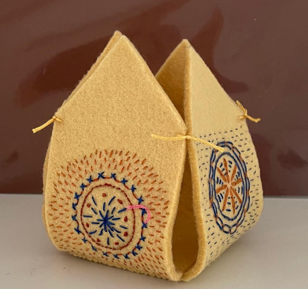 In zes of zeven bijeenkomsten ontdek je verschillende mogelijkheden van textiele werkvormen en creëer je eigen kunstwerkennaar eigen idee. We werken zowel in het platte vlak als met ruimtelijke vormen met allerlei materialen. Greet bereidt verschillende technieken voor, zoals Shashiko (borduren op denim), schilderen met textiel, borduren op foto’s. En/of ruimtelijk werk onder andere schalen maken, mobiel en vormen om ijzerdraad.
