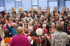 Ze waren met een afvaardiging van 7 en hun muzikant en dirigent Wolfram Reisiger. En ze straalden! Zingen is hun lust en hun leven en vandaag voor zo'n volle zaal was een hoogtepunt. Samen met Wolfram werken ze niet alleen aan hun stemmen, ze willen ook iets theatraals aan hun optreden geven. Bij het lied "Mag ik bij jou" van Claudia de Breij pinkte menig bezoeker een traantje weg en het gedicht dat Willy Hesselink voordroeg was zeer inspirerend.